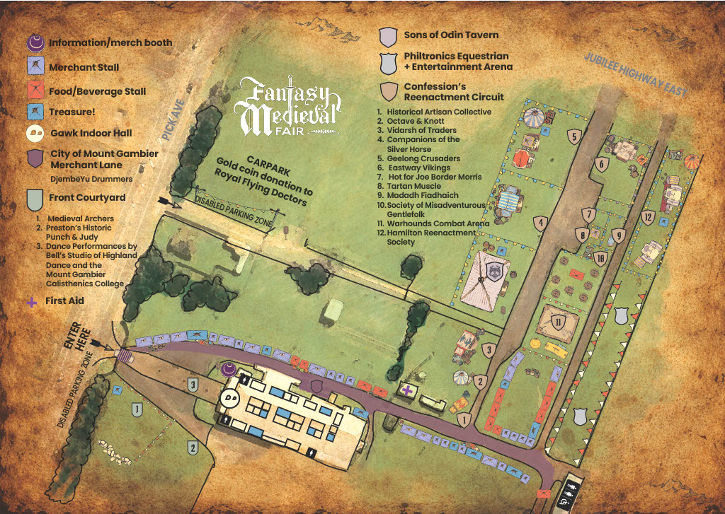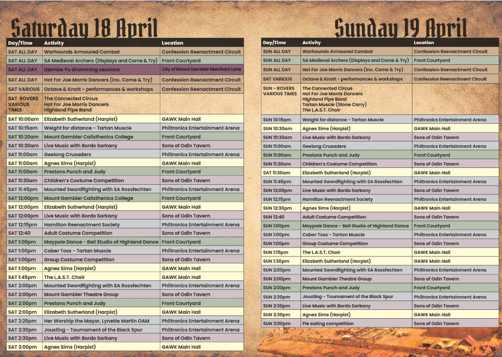 Behold, the most packed program ever to grace Mount Gambier’s Fantasy Medieval Fair. So much so that there are pop-up delights we couldn’t even include. Every corner of the fair will come alive on April 18 & 19! Be sure to get your tickets. See the schedules below or download the pdf here.